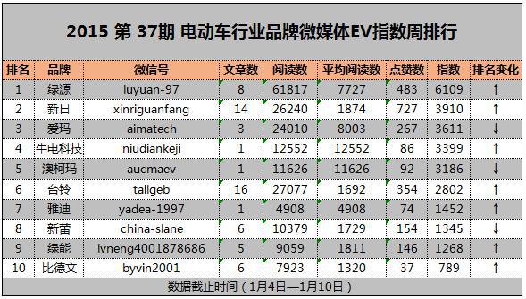 《行业品牌微媒体EV指数周排行榜》是电动车时代网数据研究中心以微信平台为数据来源,面向各电动车品牌在微信平台所发布的文章数量及质量而做出的统计,将于每周三发布上一周数据,敬请关注。