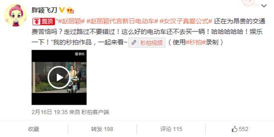 2月16号,新日官微有关女代言人的微博一经发布,评论底下赵丽颖强大的粉丝团就开始扑了上来。并纷纷表示要支持“脑公”代言的新日电动车,可谓是爱屋及乌。同时,不少网友有准备购买新日电动车的想法,且有一些狂热粉丝发起#赵丽颖代言新日电动车#的微博话题,一则粉丝自制的广告片让网友不禁感叹“脑公”后宫团的力量之强大!这是新日电动车自签约黄晓明之后,坊间引起的又一轩然大波,让业界不禁感慨新日电动车的“明智之选”!