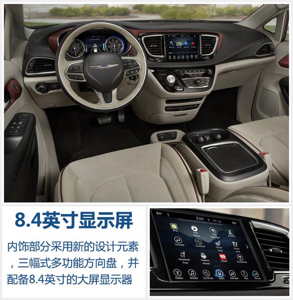 内饰部分也采用新的设计元素,三幅式多功能方向盘,并配备一台尺寸为8.4英寸的大屏显示器,可支持Uconnect信息娱乐系统,以及包含硬盘、导航、倒车影像等诸多功能。而座舱内大量使用实木和金属装饰,档位切换选用旋钮式设计。炮筒式一体液晶仪表盘也同样亮点十足,提升全新大捷龙这一商务MPV的内部科技感。此外,中控显示器下方装有三个物理旋转按钮,方便驾驶员操作。