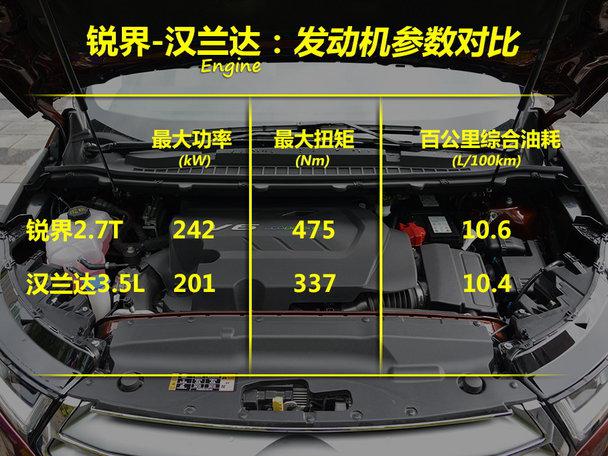从上表的横向对比中可以看出,锐界以2.7T的排量,战胜了几款主流豪华SUV的动力性能。而锐界最主要也是最直接的对手汉兰达,尽管使用了3.5L的大排量发动机,但毕竟缺少涡轮增压和缸内直喷的技术支持,在动力性能上与锐界相差甚远。