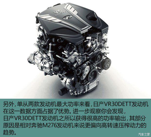 没有使用奔驰发动机的原因也许不只归结于商业层面,根据公布的性能参数可知,日产研发的代号为VR30DETT的全新3.0T V6涡轮增压发动机的最大功率已经超越了搭载在奔驰E级、S级、GLE级、GL级等车型上同排量的奔驰发动机,所以明明自家的机器性能更强,何乐而不为呢?