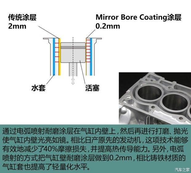 转速高就意味着单位时间内活塞摩擦气缸壁的次数就越多,因此高转速往往因为摩擦损失消耗的功率就越多,影响了燃油经济性。为了改善这一点,日产利用特有的镜面气缸内壁涂装技术(Mirror Bore Coating)。
