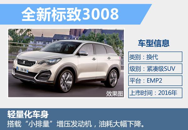 东风标致总经理李海港先生曾表示:“明年上半年将对一款在售的SUV进行换代。”在东风标致的产品线中,现有两款SUV车型在售,分别是标致2008和3008。现款标致2008于2014年正式推出,距今只有不到两年时间,换代的SUV车型有望是标致3008。新车将基于PSA(标致雪铁龙集团)的EMP2模块化平台打造,使用更多高强度轻量化材质,在保证车身强度的前提下,降低车身重量,获得更好的驾驶感受并提高燃油经济性。