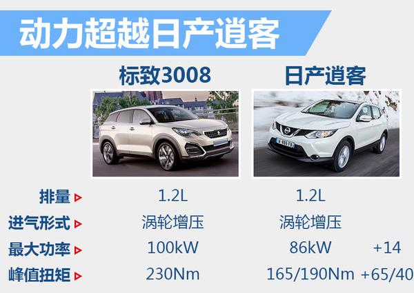 紧凑级SUV车型中,日产全新逍客也搭载了1.2升涡轮增压发动机。与之相比,PSA(标致雪铁龙集团)的1.2THP发动机在动力数据上具有很大的优势,最大功率比竞争对手高14kW,而峰值扭矩则比逍客不同调校1.2T发动机分别高65和40Nm。而全铝发动机主体,轻质涡轮等技术的应用也使它在同级车型中非常具有竞争优势。
