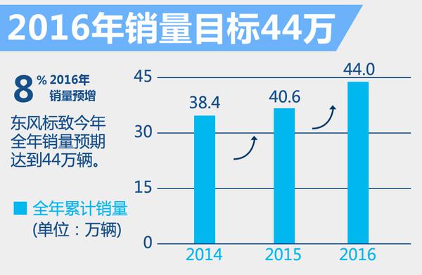 2015年东风标致整车销量为406,107辆,与2014年的384,005辆相比,增加2.2万辆,增长幅度达到了5.76%,增速位列合资品牌第四位。2016年,神龙汽车确立了77万辆的销量目标,其中东风标致品牌的销量目标44万辆。对比2015年东风标致全年销量可以看出,2016年东风标致全年销量预期增长8.4%。(网通社 2016年2月16日北京报道)
