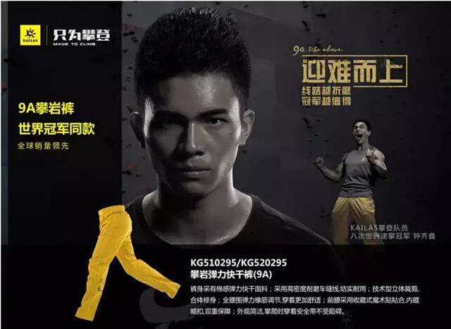 作为凯乐石品牌春夏的重磅新品,"9A"一经面世便迅速成为行业焦点,其以个性的设计,精细的做工,专业的面料享誉业界,受到市场的青睐。通常专业的户外产品总被界定为在特定的环境中才可使用,但是"9A"攀岩裤的推出打破了这一常规,户外裤装的功能性与展示度在这一刻得到完美融合。