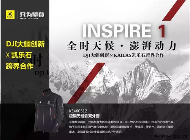 DJI大疆创新首次跨界专业户外品牌凯乐石凯乐石,推出"Inspire1"联名款飞行器×软壳套装,以澎湃强劲的科技动力迎接新年的到来。正是由于凯乐石与大疆有着相同的"科技、创新、专业"的品牌DNA,从而促成了这次的跨界,通过此次合作展示出了双方最尖端的科技、性能最佳的产品,共同探索极致未来的无限可能。