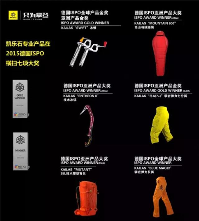 1月底,专业户外品牌凯乐石选送的六款专业产品凭借其创新设计获得德国慕尼黑ISPO大奖(ISPOAWARD)专业评审们的一致好评,横扫七项德国ISPO产品大奖。其中"牛A(7+)攀岩弹力七分裤"获得亚洲产品金奖,"BlueMagic"攀岩弹力长裤斩获重量级的全球产品大奖,"SWIFT"冰锥更是荣膺最具分量的全球产品金奖与亚洲产品金奖双料大奖!凯乐石不仅仅成为本届德国ISPO大奖得奖数最多的品牌,也是德国ISPO大奖设立至今单届获奖次数最多的品牌!
