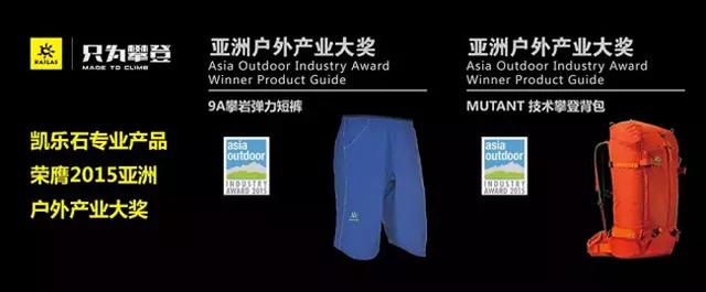 一直以来,凯乐石品牌始终坚持专业攀登为产品的主题与品牌精神,以专业与原创精神在业界独树一帜,屡屡斩获户外行业内许多世界级的重要奖项。今年的亚洲户外产业评奖也不例外,凯乐石Mutant攀登背包&9A攀岩短裤荣膺2015亚洲户外产业大奖,受到了专业人士的一致肯定。