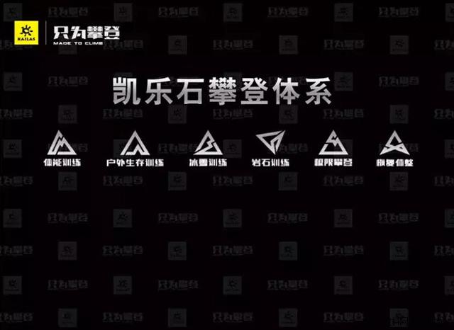 "凯乐石攀登体系"是凯乐石资源整合营销平台的统称,它将普通户外爱好者从零基础开始,到可以进行高海拔攀登的整个训练过程系统化为"体能训练""户外生存训练""冰雪训练""岩石训练""极限攀登""恢复休整"六个模块,通过有计划性的训练,让普通人成长为专业攀登者。"凯乐石攀登体系"的推出,第一次将完整的攀登行为定义为六个相关联的阶段,并且通过项目训练将这六个阶段有机结合。