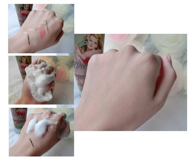 作为一款洁面产品,清洁能力是我比较看重的。在手背上涂上常用的眼线,粉底液,口红和眉笔,然后用洁面泡沫来清洁手背。泡沫在手背稍加按摩后,奇迹发生了,手背涂的彩妆慢慢的全部被泡沫稀释溶解了,一会儿功夫手背就干干净净的,就连最难卸的眼线笔也给清洗的特别干净,看来这款洁面泡沫的清洁能力很棒哦。