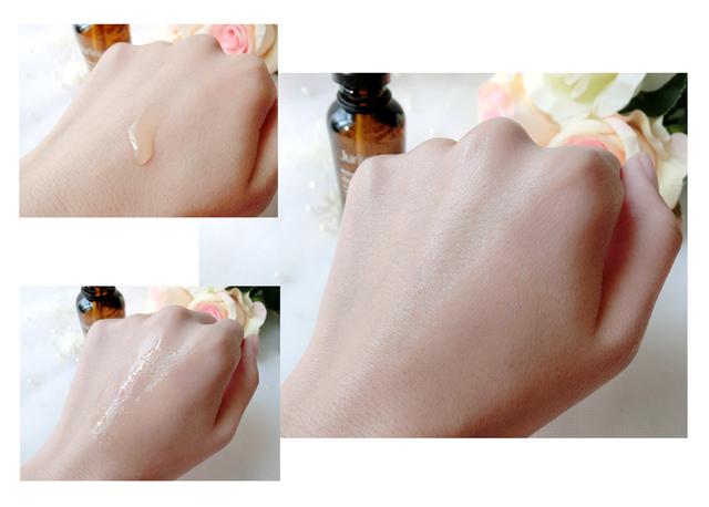 滴一滴在手背上,清泉般的透明液体,有淡淡的怡人芳香,触感极为细腻,感觉很温和,轻轻推开的时候又感觉比较轻薄,延展性非常好,稍作按摩很容易就被肌肤吸收了,使用过的肌肤看起来细腻光滑,还很有光泽感,仿佛又恢复了年轻状态一般。