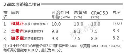 同时,本刊综合可溶性固形物、总黄酮、ORAC 5.0功效测试三项指标对3品牌凉茶进行综合排名的结果显示,和其正凉茶综合评价得分相对较高,王老吉凉茶次之,加多宝则较低。