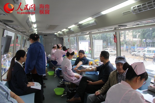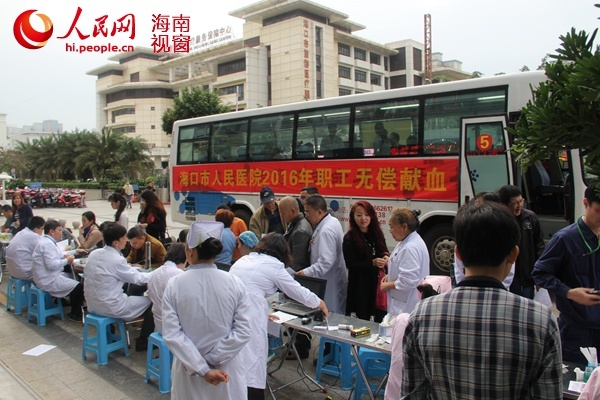 人民网海南视窗海口1月14日电 寒假临近,海南省冬季献血淡季即将到来,血液出现供不应求的局面。为保障临床用血需求,1月13日上午,海口市人民医院在院大楼门前组织开展该院2016年无偿献血活动。