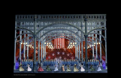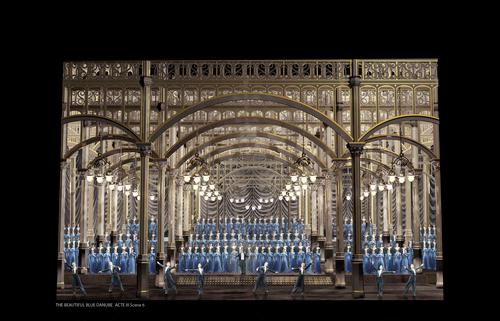 此次复排的一大看点是“升级版”的多媒体舞美设计。据悉,法国著名舞美设计师艾曼妞·法弗雷翻阅了大量19世纪的珍贵史料及图片,力求在舞台上真实呈现19世纪的欧美城市风貌——第一幕中,她在旧时维也纳宫廷的图片中获得灵感,设计出金碧辉煌的宫殿,生动描绘了施特劳斯在欧洲的音乐生活环境;第二幕中,她将美国的波士顿港口和曼哈顿设计得美轮美奂,足以达到“穿越”效果;而对于第三幕举办庆典音乐会的万人剧场,她更是从有关史料记载中抽丝拨茧,最终采用钢筋结构打造,力求“还原”历史上真实的大剧场。值得一提的是,担任本剧多媒设计的塞尔乔·梅塔里,曾在国家大剧院制作歌剧《游吟诗人》中,以恢弘魔幻如3D大片的多媒体视效给观众留下深刻印象,在此次《美丽的蓝色多瑙河》中,他将再次启用高科技的3D投影技术,投射出灯红酒绿的美国繁华街区,以及波士顿剧场中气势恢弘的万人大合唱场景。