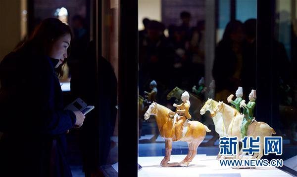 观众在台北欣赏河南博物院收藏的唐代三彩骑马持排箫男乐俑。新华社记者姜克红摄