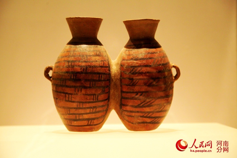 彩陶双联壶1972年出土于河南省郑州市大河村遗址,器物造型新颖,色彩鲜艳,双腹相联,成双成对,是仰韶文化大河村类型彩陶中唯一的一件联腹壶,堪称新石器时代仰韶文化的艺术精品。