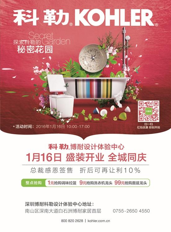 科勒深圳设计体验中心,2016年1月16日盛大揭幕,届时将会推出进店领好礼、厨卫大联动、总裁感恩签售、幸运大抽奖等多重优惠。心动的朋友赶