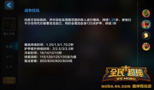 战争狂吼:向敌方目标跳跃,并对目标及周围范围的敌人进行嘲讽,持续1.25秒(满级2秒),使他们不计任何代价都要攻击自己,同时会增加自身120点护甲,持续2秒(满级3. 5秒)