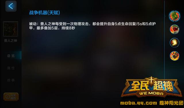 战争机器(天赋):被动 兽人之神每受到一次物理攻击,都会提升自身5点生命回复/5s和5点护甲,最多叠加5层,持续8秒。