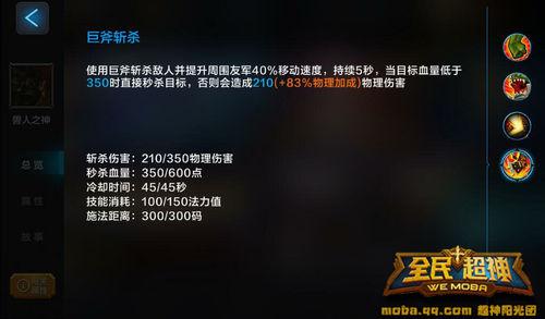 巨斧斩杀:使用巨斧斩杀敌人并提升周围友军40%移动速度,持续5秒,当目标血量低于350(满级600)时直接秒杀目标,否则会造成210(满级350)(+83%物理加成)物理伤害