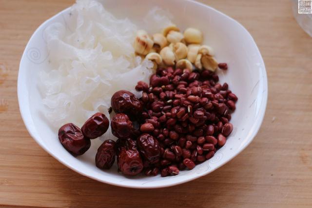 红豆80克,银耳5克,水800ml,红枣7颗,莲子一小把。