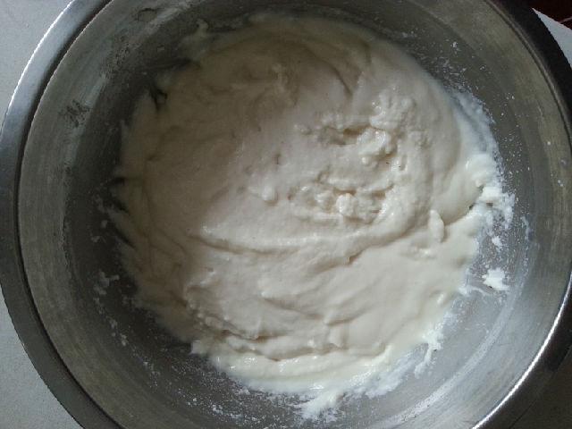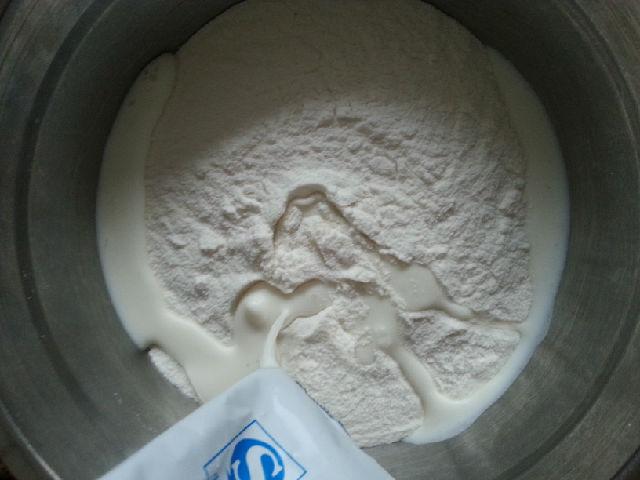 2、牛奶慢慢地加入糯米粉中,边加边搅拌。