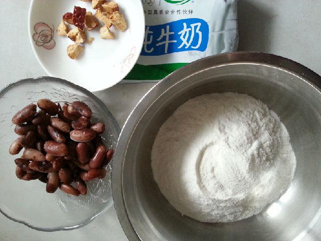 1、原料:糯米粉、牛奶、红豆(提前泡水煮熟)、红枣。