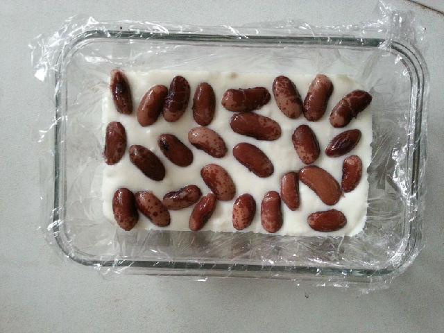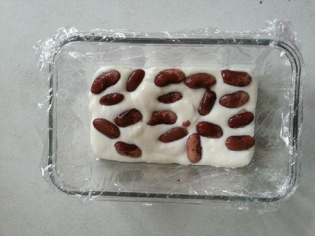 6、将糯米糊倒入一部分在容器中,铺上一层红豆,再倒上一层糯米糊。
