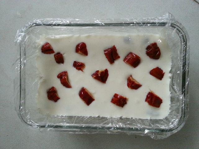 8、将剩下的糯米糊倒入容器中,将红枣均匀的铺在上面,(我用的是干红枣,提前用水泡湿后再用),锅中烧开水,将容器入蒸锅中,大火蒸25分钟即可,取出晾凉后切块。