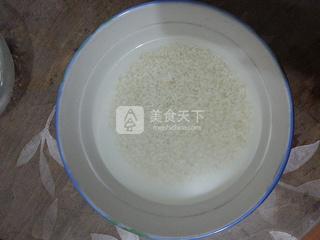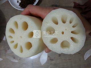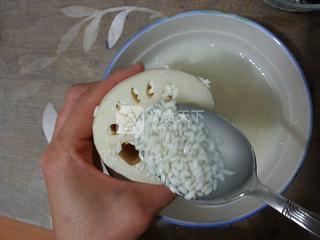 藕竖在碗中,用勺子连水带糯米向藕孔中灌入,这一点要有耐心。随着糯米粒不断的进入藕孔中,水便被挤出来。慢慢将藕孔灌满藕孔。
