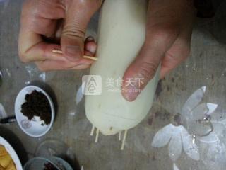 将切下的那一块头部重新安上,用牙签固定住。藕身可以用牙签戳一些小眼,以便焖煮时更入味。