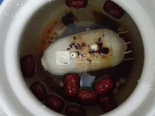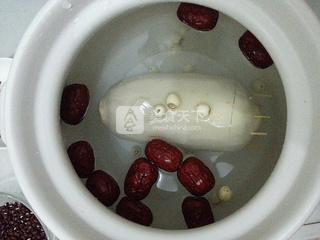 我用的是陶瓷煲,将藕节放入,加入没过藕的清水,将莲子、红枣加入锅中。