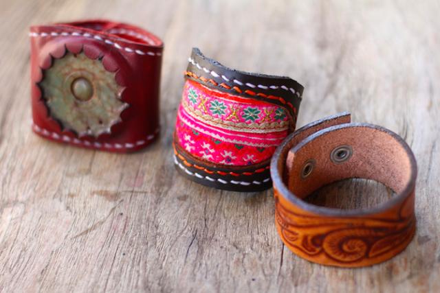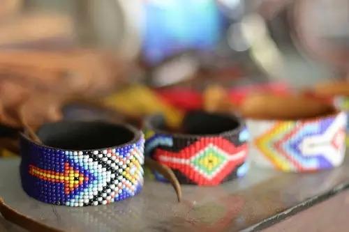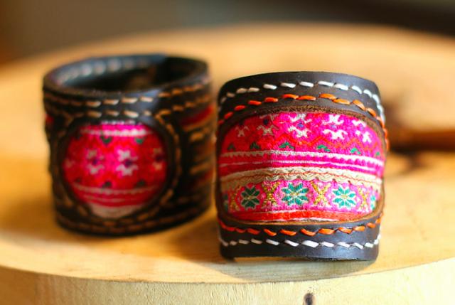 制作皮革手镯先要选合适的皮革,然后把之前自己所设计的图案跟具民族特色的布缝在一起。我觉得缝纫是皮革制作中比较困难的地方,因为我们要很专注地把线、布和皮穿在小孔中。最后,我们制作了两条手镯,一条是有民族特色的,另外一条是有蛇臂章与贝壳的皮革手镯。