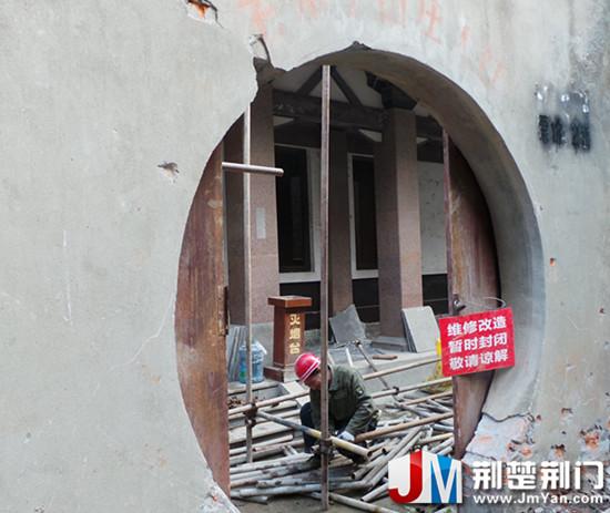 荆楚荆门网讯(罗蒙 孙红梅)11月26日,作为荆门历史上的“三台八景”之一,有“荆楚历史文化内涵展示窗口”之称的老莱子山庄正式启动一期改建项目。只见老莱子山庄正、配殿外装有许多脚手架,一位工人正在用工具撬起正殿门口原有的地砖,正殿内除原有的浮雕画像及老莱子生平简介外,装饰品已基本搬离,地面上堆放着许多建筑材料。正殿后,几名工人正在认真的安装脚手架,拱门外挂着“维修改造,暂时封闭,敬请谅解”的告示牌。