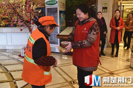 荆楚荆门网讯(罗蒙 翟蓓蓓 张琴)腊月初八是腊八节,古时候人们有在腊八节这天施粥的传统,2016年1月17日腊八节,荆门市义工联、市旅游协会联合城区6家酒店在城区开展“共享一碗粥 爱在腊八节”腊八施粥大型公益活动,为城区的环卫工人、交警和福利院的老人们送上腊八粥。