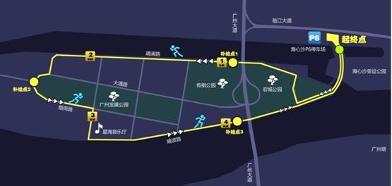 本次比赛采取荧光夜跑的形式,参赛选手从海心沙亚运公园出发,途经宏城公园、传祺公园、广州发展公园、星海音乐厅,再返回至出发点,全长5公里。纵观整个赛道,环境优美,贯穿园林,与小蛮腰隔江而望,是一条绝佳的夜跑路线。