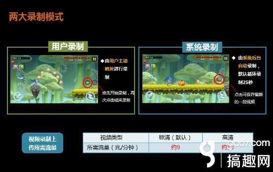 嵌入录像SDK的游戏界面上会出现一个操作浮窗,用户点击浮窗上的录制按钮即可将正在进行的游戏画面录成视频。录制视频主要有两种模式,一种是用户录制,需用户主动发起点击开始和结束;另一种为系统录制,后台自动循环录制,默认循环录制25秒。录制视频时有标清和高清两种清晰度供用户灵活选择。此外,录制成功的视频还可以进行二次编辑,增加语音解说或文字说明,一键分享至咪咕游玩、微信、QQ等平台。值得一提的是,用户在嵌入录像SDK的游戏中录制的视频会自动同步到咪咕游玩APP中,也就是说,基于SDK这一核心工具,咪咕游玩将汇集海量UGC手游视频。