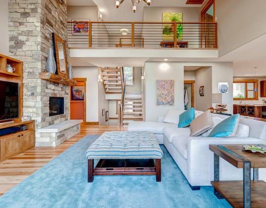 淡蓝色的地毯为古朴的别墅带来一股清新之风,L型的沙发隔断出客厅与厨房空间,让大户型的别墅客厅也拥有温暖的生活气息。
