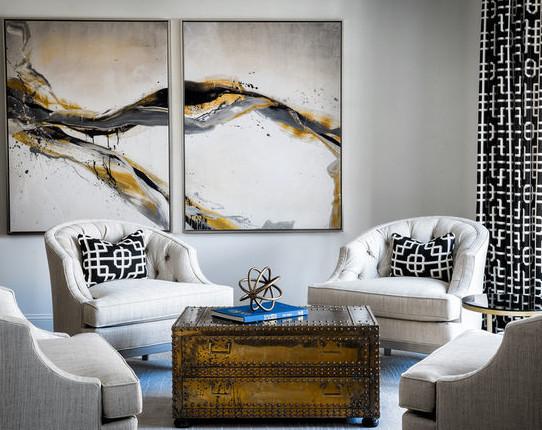 首先映入眼帘的便是两幅断而相连的挂画,给生活空间带来优雅的艺术气息,与古朴的铁艺皮箱相呼应,小小的空间格调十足。