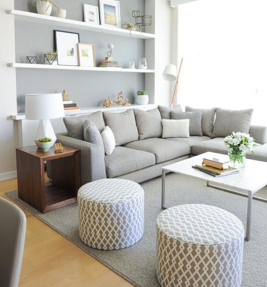 沙发后的隔板柜成了客厅的收纳之处,细致的小摆件也成了客厅的美观背景墙,一束白色的淡雅小花与客厅的简约之风不谋而合,造就空灵的生活空间。