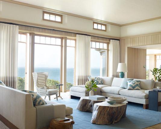 落地窗户外的磅礴景致,让室内也有了大气,粗犷的木质茶几把户外的野性自然带到生活,蓝白搭配清新淡雅,舒适自在。