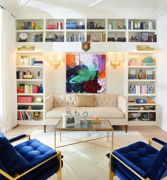 这款小户型客厅将沙发后的背景墙全都做成收纳柜,为小户型空间开辟出不少实用空间,色彩斑斓的橱柜饰品和杂物与沙发的明丽一起散发着生活的欢乐活力。