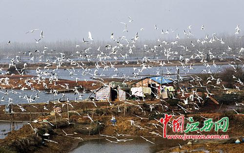 据悉,2015年进入冬季以来,鄱阳湖迎来罕见的冬汛,候鸟只能往沿湖的农田、菜地、鱼塘觅食。梁乔玥 江西记者梁振堂摄