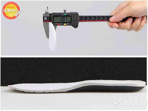 将这款鞋的鞋垫取出,用手抚摸,感觉鞋垫硬度适中、并有一定的弹性,经过测量,鞋垫的前部厚度为1.89mm,中部足弓位置厚度为2.87mm,向上凸起,跟幼儿足弓相贴合,有助于承托宝宝的足弓,减少行走时产生的疲劳。