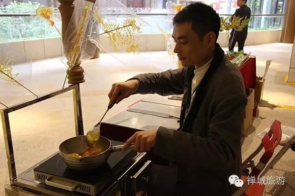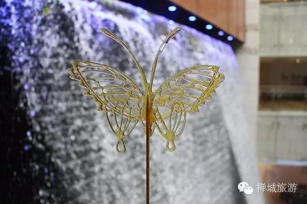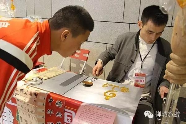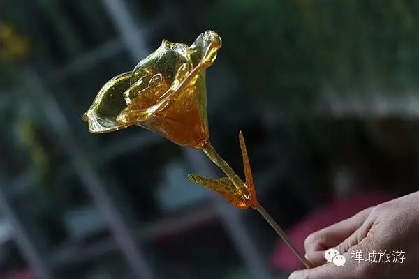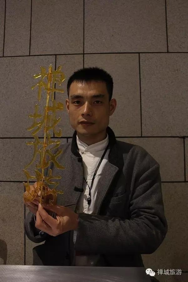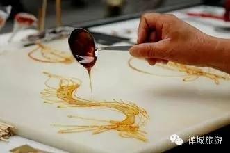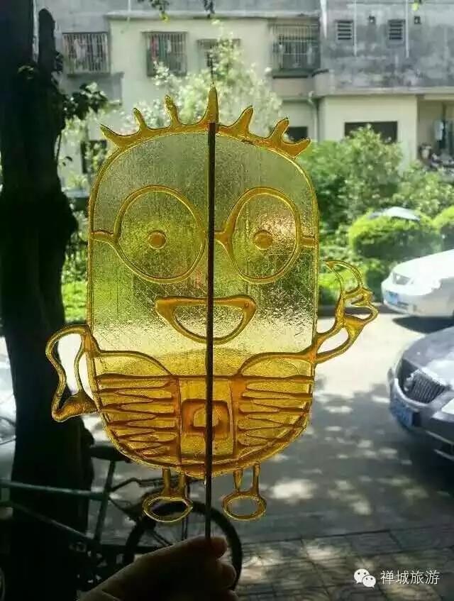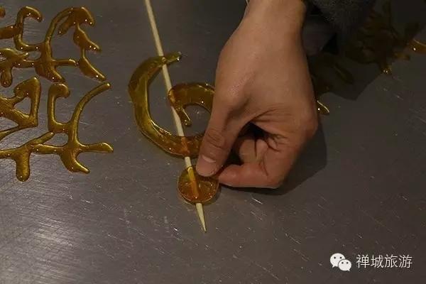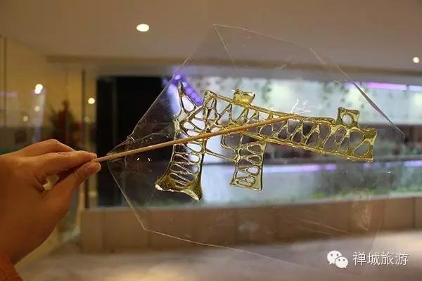 一勺融化了的糖浆在铁板上快速来回浇铸,一气呵成,眨眼间,蝴蝶、猴子、飞龙等便跃然在铁板上。几条仿真塑料叶在他巧手下上挑下掐,魔术般地变出了凤凰、蚱蜢、小鸟……