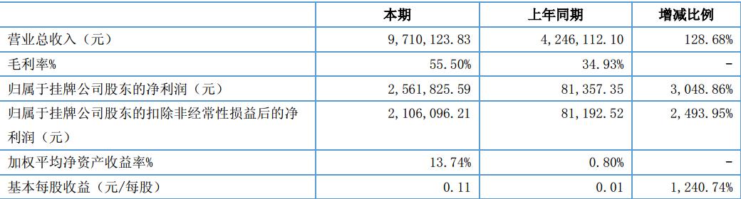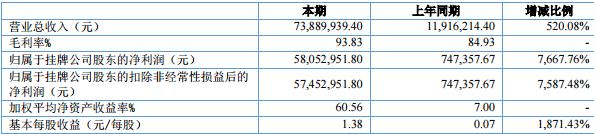 报告期内,分豆教育实现营业收入 73,889,939.40 元,较去年同期增长 520.08%。实现归属于挂 牌公司股东的净利润 58,052,951.80 元,基本每股收益 1.38 元。