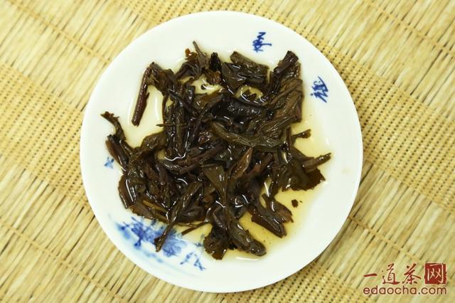 黑茶喝到茶味明显变淡时可停止冲泡,此时鉴别叶底,最后的叶底呈青褐色,尚油润,用手轻捏,叶底柔软有弹性,可见其选料确实不错。