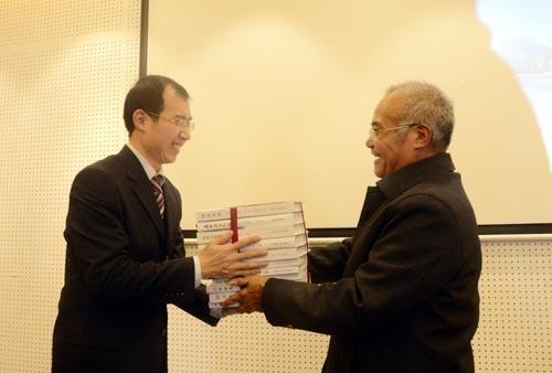 张福有向诗词中国代表沈昊赠书。李景喜 摄