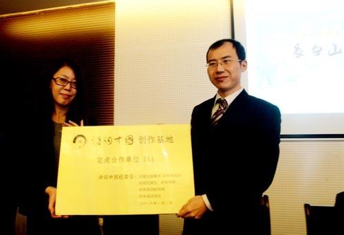 诗会期间,诗词中国组委会代表、中国出版集团中版文化传播公司总经理助理沈昊向“诗词中国创作基地定点合作单位”一山一蓝生态主题酒店、长白山历史文化园授牌。中华诗词论坛坛主、吉林省诗词学会会长张福有,向诗词中国组委会赠送历年采风诗集等11本。自2007年以来8年间,张福有组织了17次关东诗阵的采风创作,主编并在吉林人民出版社出版了14本大型主题诗集,共收录近3万首旧体诗词,丰富和发展了长白山诗词流派,为以诗证史留下重要文化财富,做出开拓性贡献,被国内诗词界誉为“诗词铁军”和“骆驼精神”。